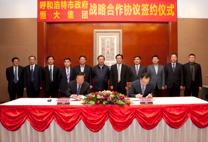 21日下午,恒大集团与呼和浩特市政府进行战略合作协议签约。恒大集团董事局主席许家印、内蒙古自治区副主席白向群等出席签约仪式。恒大集团副总裁、呼和浩特公司董事长时守明,呼和浩特副市长孙建华分别代表双方签约。根据协议,2013年至2017年期间,恒大集团将与呼市共同打造六个项目,包括新华广场城市地标项目、东南部民生地产项目及其他高端精品住宅综合开发项目等。以上项目投资巨大,对推动呼市城市建设、经济发展,丰富市民旅游文化生活具有重大意义。