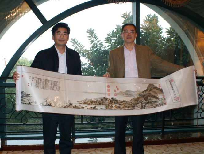 王战营市长向夏海钧总裁赠送蒲绣《富春山居图》