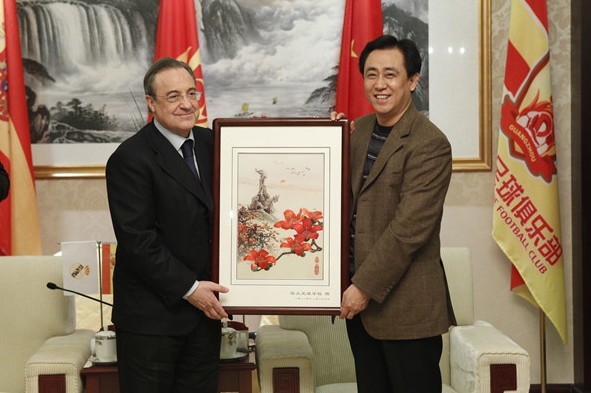 最后,宾主双方还交换礼物。许主席赠送给弗洛伦蒂诺的是一幅绣有五羊雕像和木棉花的广绣,寓意着广州足球红红火火。弗洛伦蒂诺主席则向许主席回赠了印有许家印名字的皇马8号的球衣。会见结束后,弗洛伦蒂诺主席参加了许主席专门为他准备的欢迎晚宴。