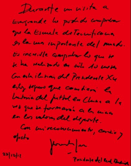 在访问恒大期间,我亲身验证了恒大皇马足球学校是在全球范围最重要的一间足球学校。更加难以置信的是它仅在短短的10个月就完成了。我坚信许家印主席对足球事业的极大热情,必将会改变中国足球的历史,并培养出更多优秀的真正理解体育价值的孩子们。