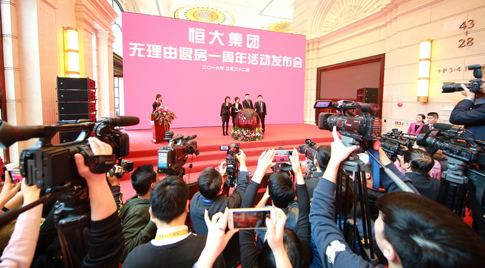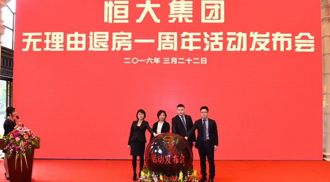 3月22日,恒大地产“无理由退房一周年活动发布会”在广州及全国172个城市同步举行。得益于无理由退房的实施,恒大去年累计销售2013.4亿元,销售面积2551.2万平方米,均创历史新高,而退房率仅为0.91%。