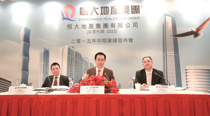 2015年中期业绩发布会现场,中为董事局主席许家印,右为董事局副主席、总裁夏海钧,左为首席财务官兼执行董事谢惠华