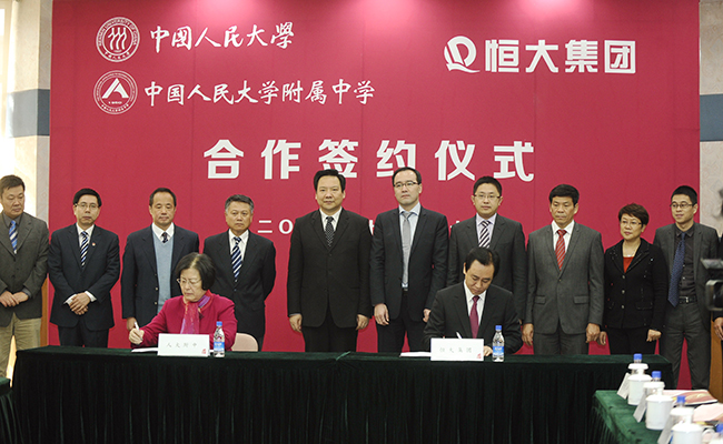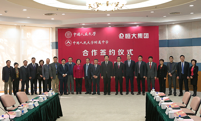 中国人民大学校长陈雨露,中国人民大学党委常务副书记牛维麟,中国人民大学党委副书记兼副校长王利明,国务院参事、人大附中校长刘彭芝,人大附中党委书记兼副校长刘小惠等多位人大、人大附中领导,恒大集团董事局主席许家印,恒大集团副总裁、恒大集团北京公司董事长时守明,恒大集团副总裁、恒大足球学校执行校长刘江南,恒大集团副总裁刘永灼、柯鹏、许晓军、伍立群、恒大足球学校副校长周正敏以及人大学生代表,以及全国百家媒体记者参加了签约仪式。